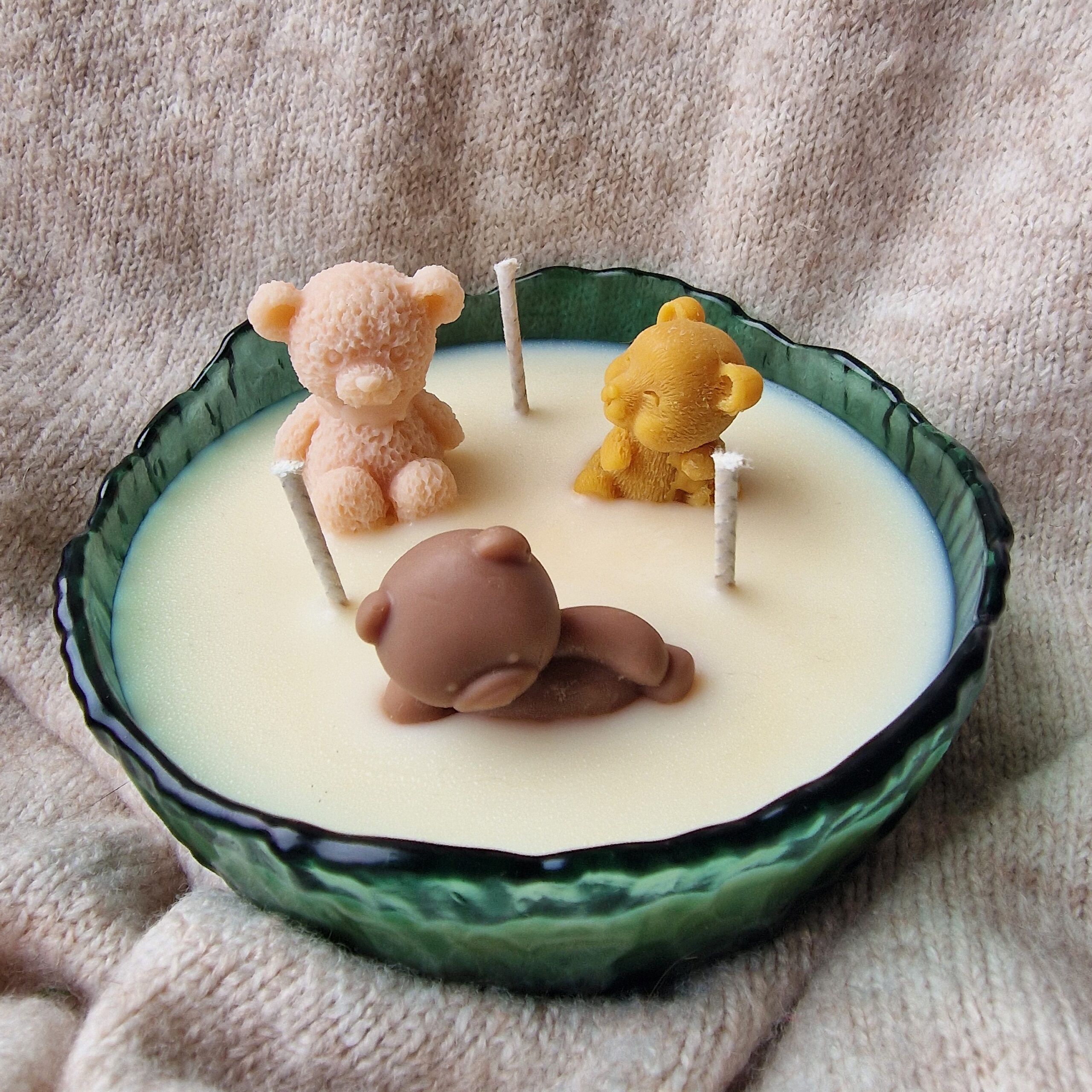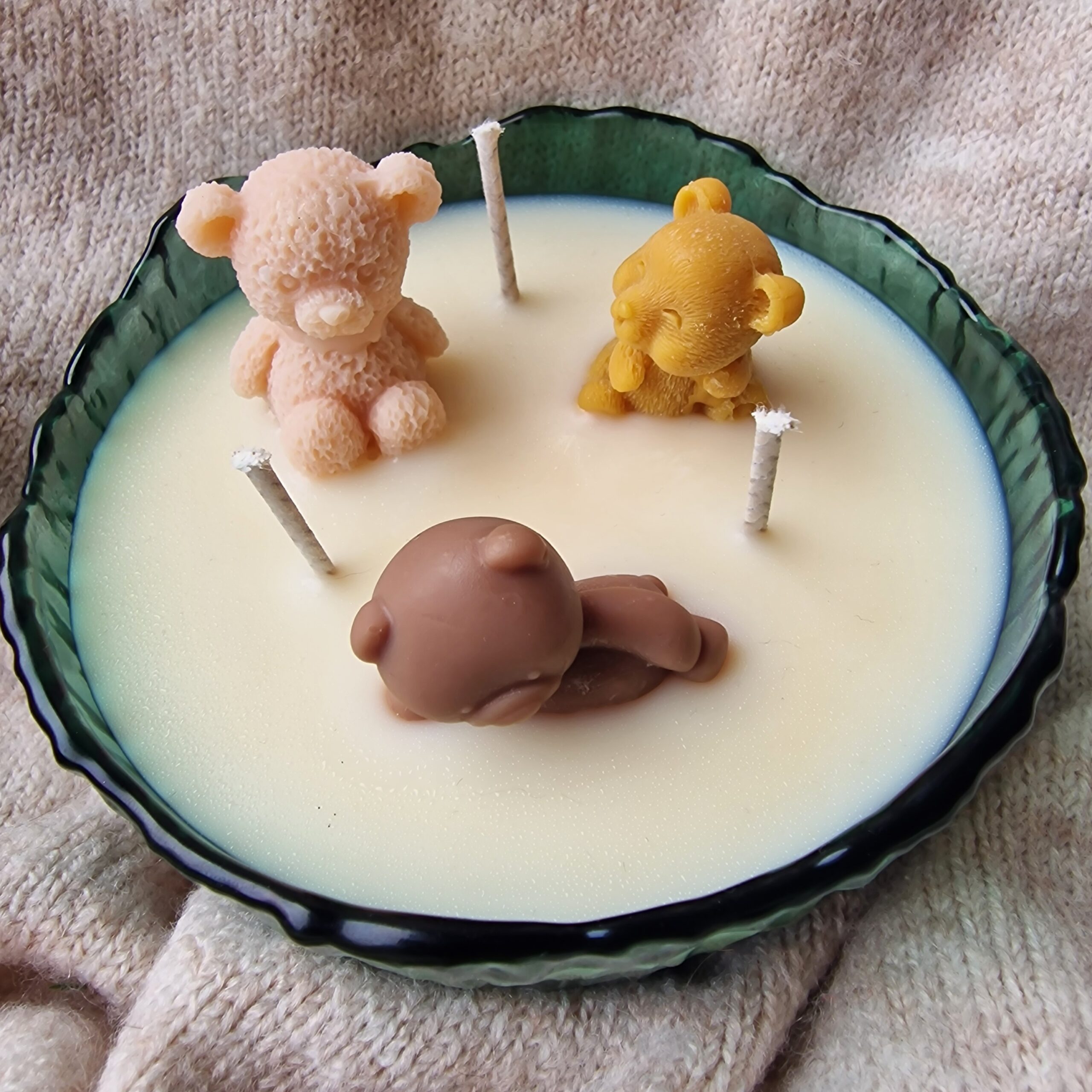 Lumanare decorativa Bear Pool, turnata manual, cu ursuleti din ceara si arome de caramel, ciocolata alba si ciocolata cu portocala. Design unic si cozy.