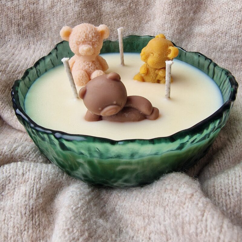 Lumanarea decorativa Bear Pool este o piesa de decor spectaculoasa si adorabila, realizata manual, care transforma orice incapere intr-un spatiu cald si cozy. Inspirata de conceptul unei „piscine” de ceara parfumata, lumanarea include trei ursuleti modelati manual, fiecare avand propria aroma: caramel dulce, ciocolata alba fina si ciocolata cu portocala usor fructata. Este o lumanare perfecta pentru iubitorii de produse handmade, pentru cadouri speciale sau pentru decorarea casei in stil modern si jucaus.